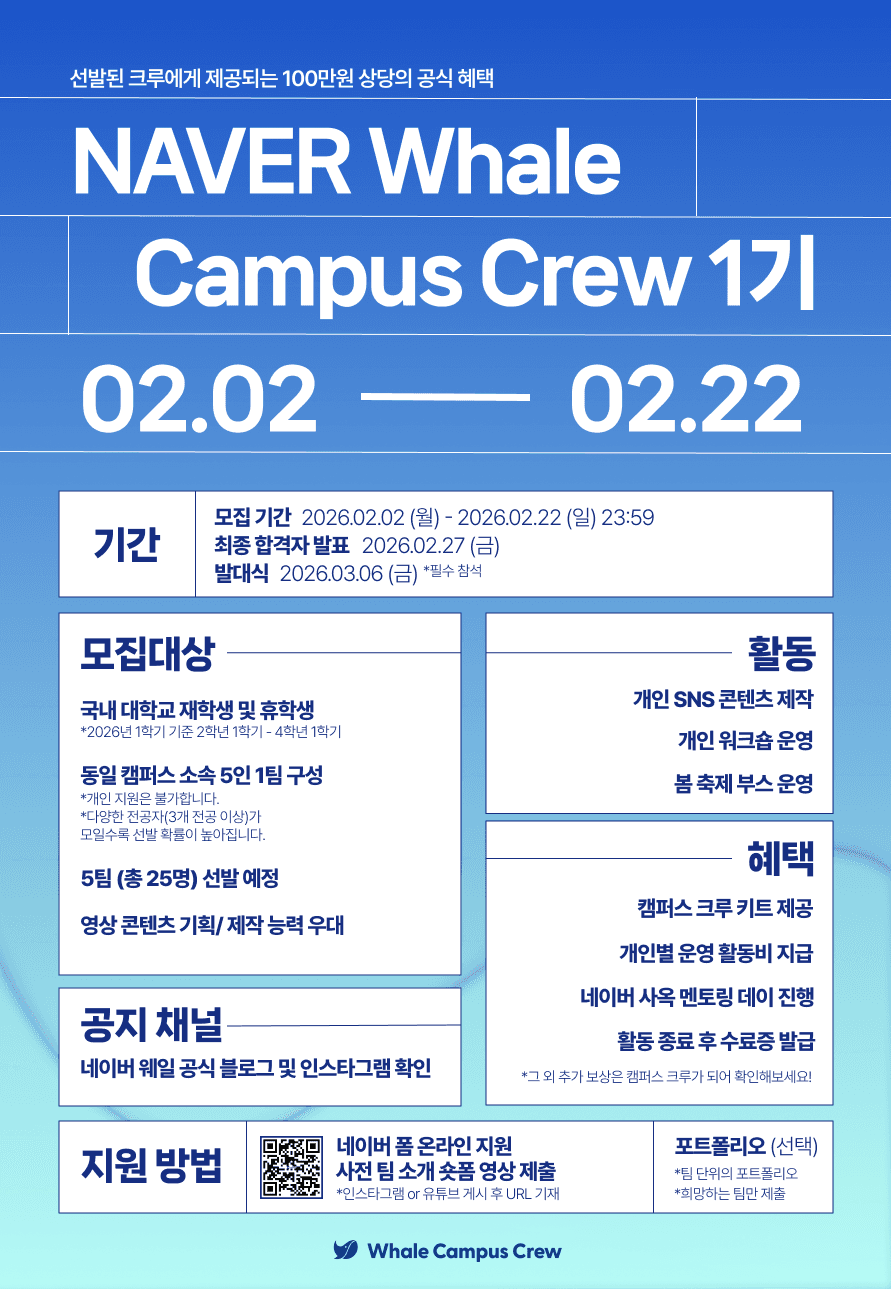 2026 네이버 웨일 대학생 앰버서더 [웨일 캠퍼스 크루] 1기 모집 (~2/22)