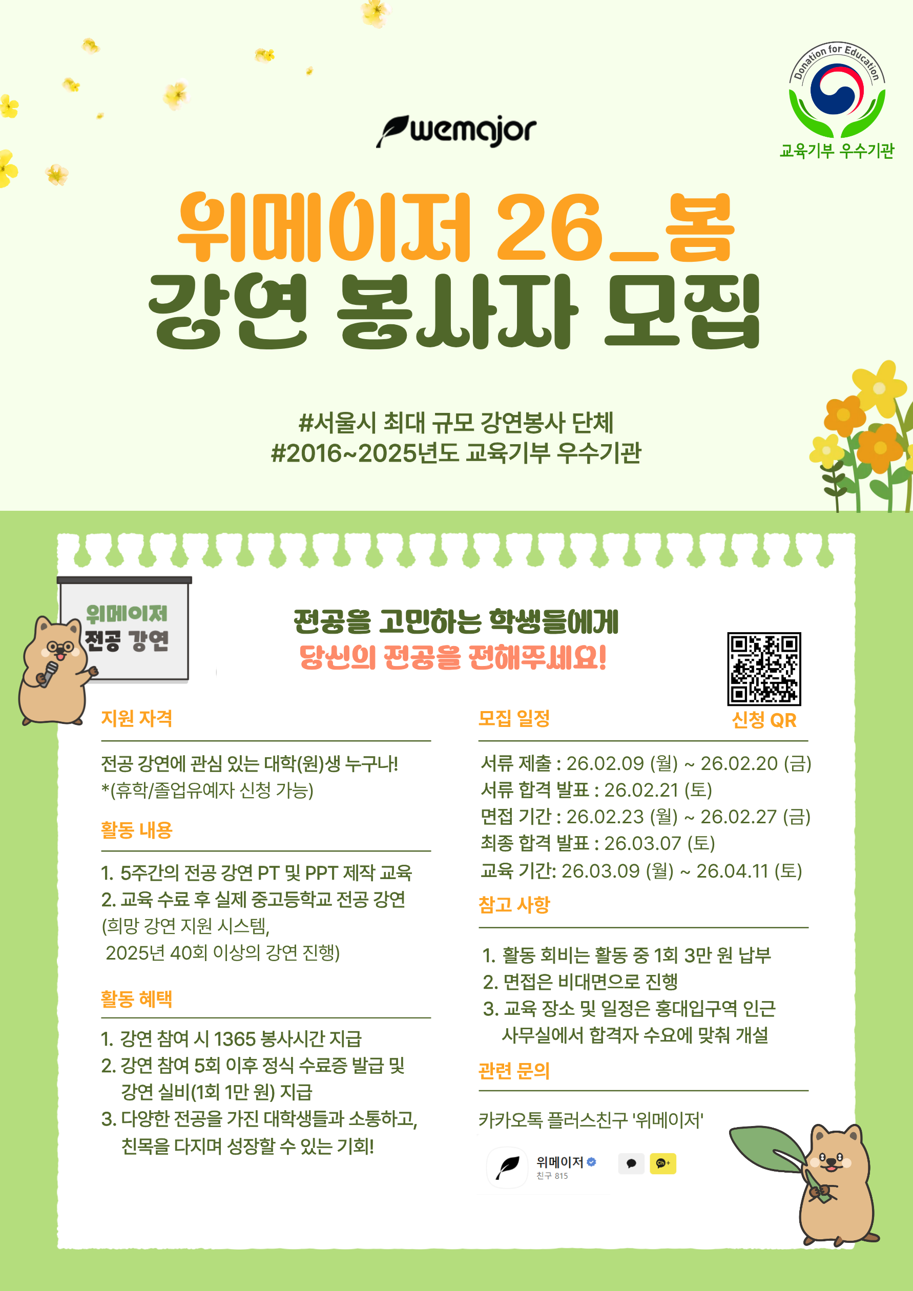 📍활동혜택 : PPT제작 스킬 & PT실력 향상, 강연 시 봉사시간 지급, 교육 및 의무강연 수료 후 수료증 발급 및 강연실비(1만원/회) 지급