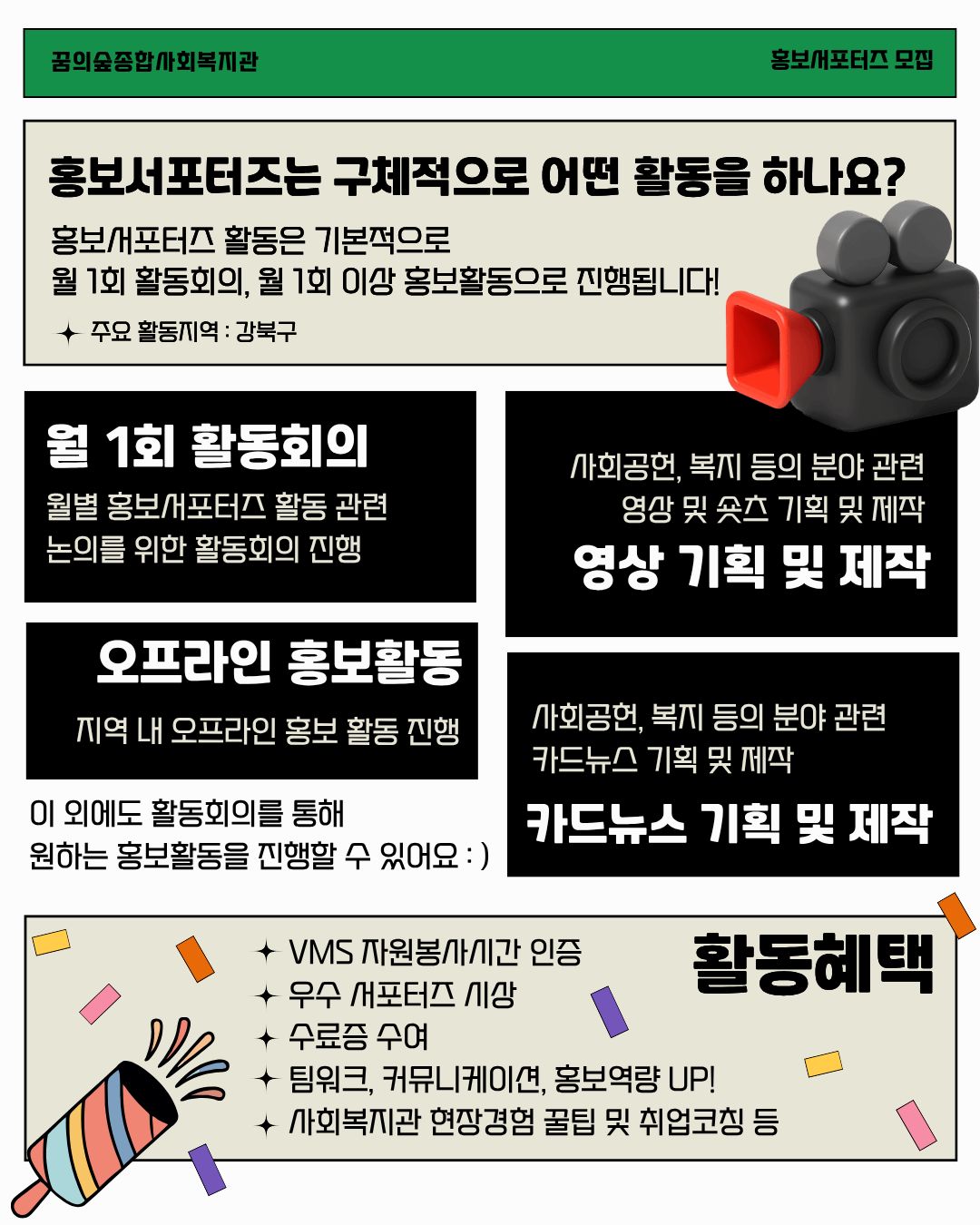 #대학생서포터즈 #홍보서포터즈 #대외활동추천 #사회복지관 #콘텐츠제작 #영상제작 #SNS운영 #VMS봉사 #꿈의숲종합사회복지관