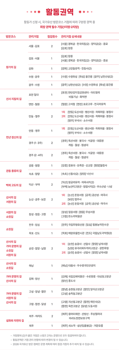 ‘국가유산 방문코스 활동가’는 전국 곳곳에 위치한 매력적인 우리 국가유산을 여행하는 방문자들을 위한 ‘방문자 여권 투어’의 셀프 체험존을 직접 돌아보며 관리합니다. 국가유산의 아름다움을 직접 보며 가치 있는 활동을 이어나갈 여러분의 적극적인 지원을 기다립니다.