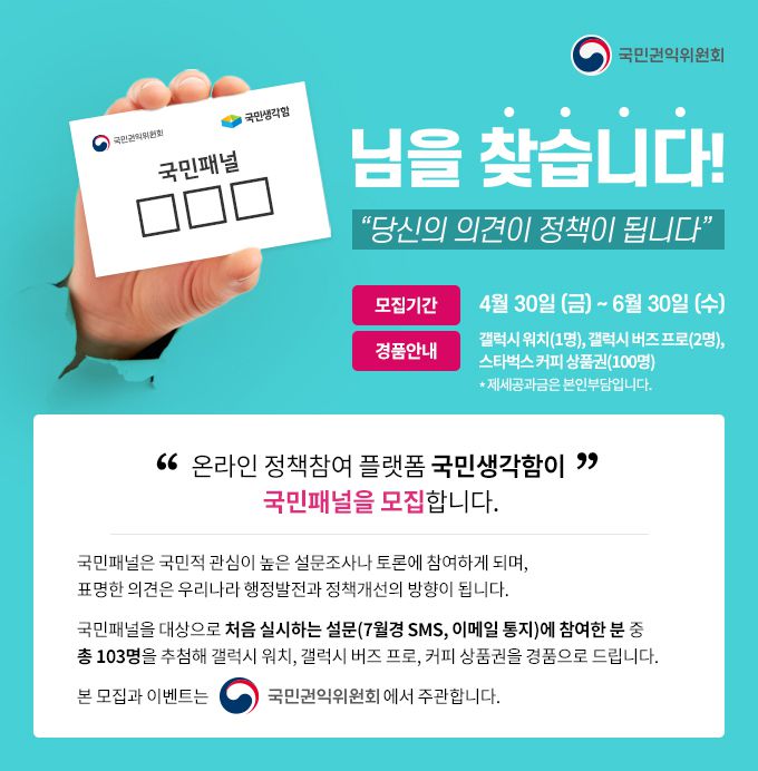 “온라인 정책참여 플랫폼 국민생각함이 국민패널을 모집합니다.”