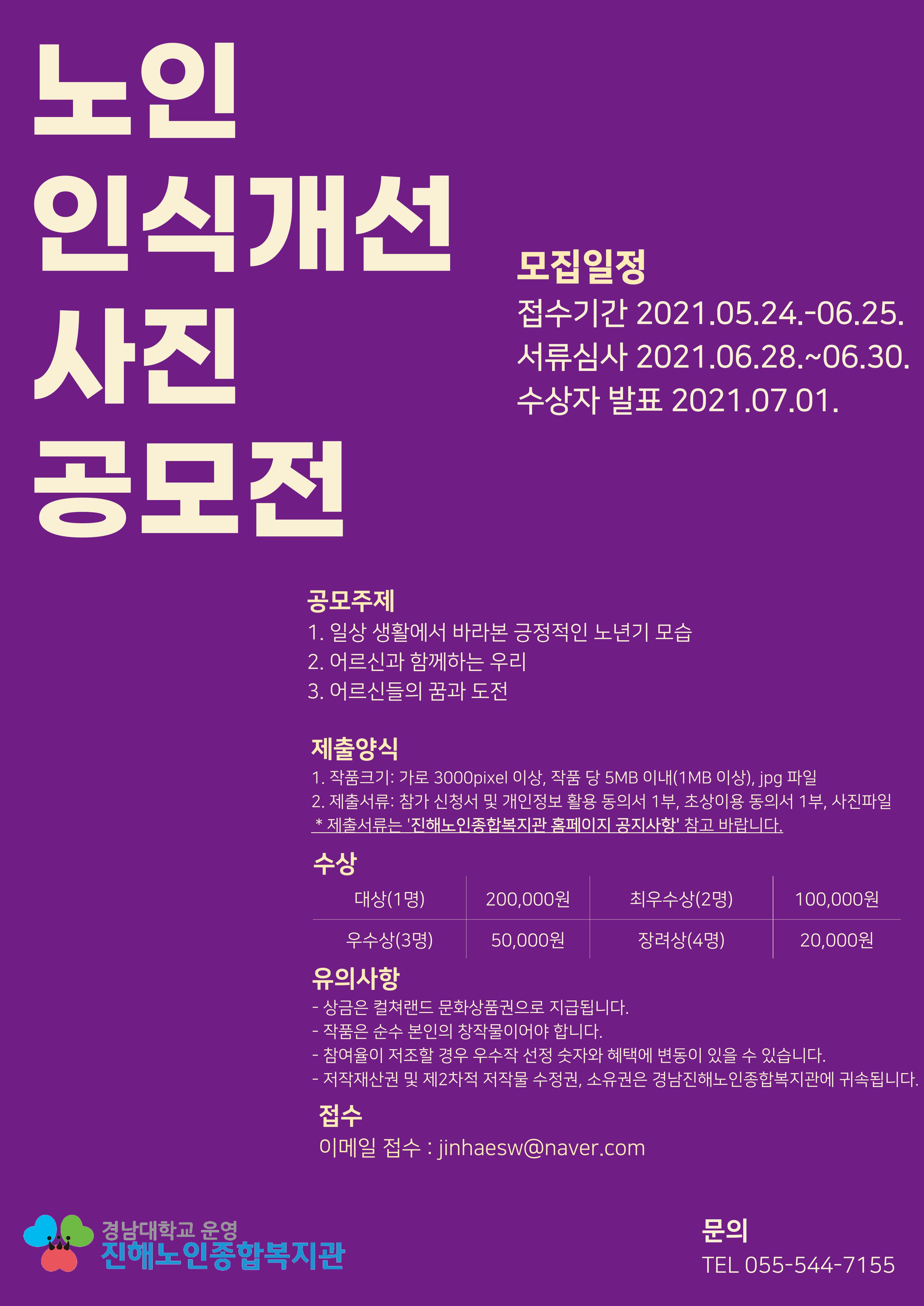 - 심사대상 사진 파일, 참가신청서 및 개인정보 활용동의서, 유의사항 및 초상이용동의서 첨부 후 진해노인종합복지관 메일( jinhaesw@naver.com )로 접수