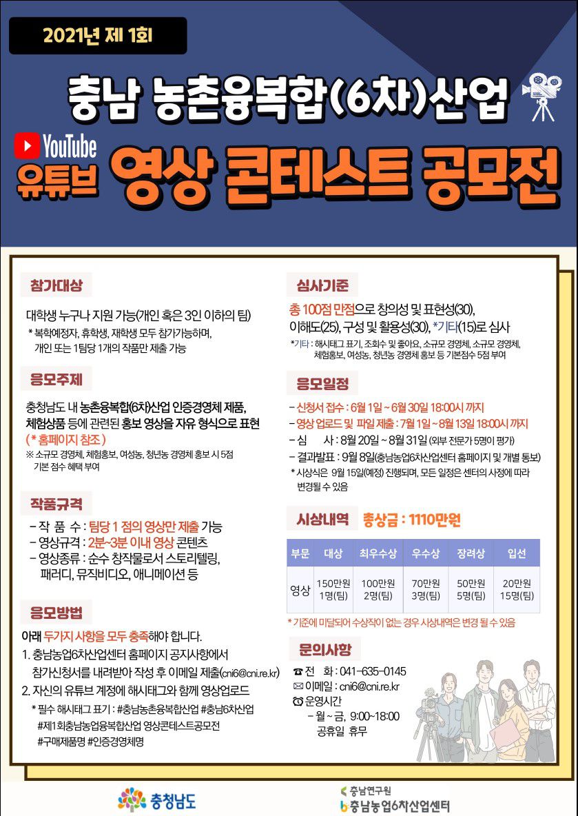 (재)충남연구원에서는 농업‧농촌과 충남도내 농촌융복합(6차)산업에 대한 20대 젊은 대학생들의 관심을 높이고 농촌융복합(6차)산업 활성화를 도모하기 위해 아래와 같이 유튜브 영상 콘테스트를 개최하오니, 관심 있는 대학생들의 많은 참여 바랍니다.
