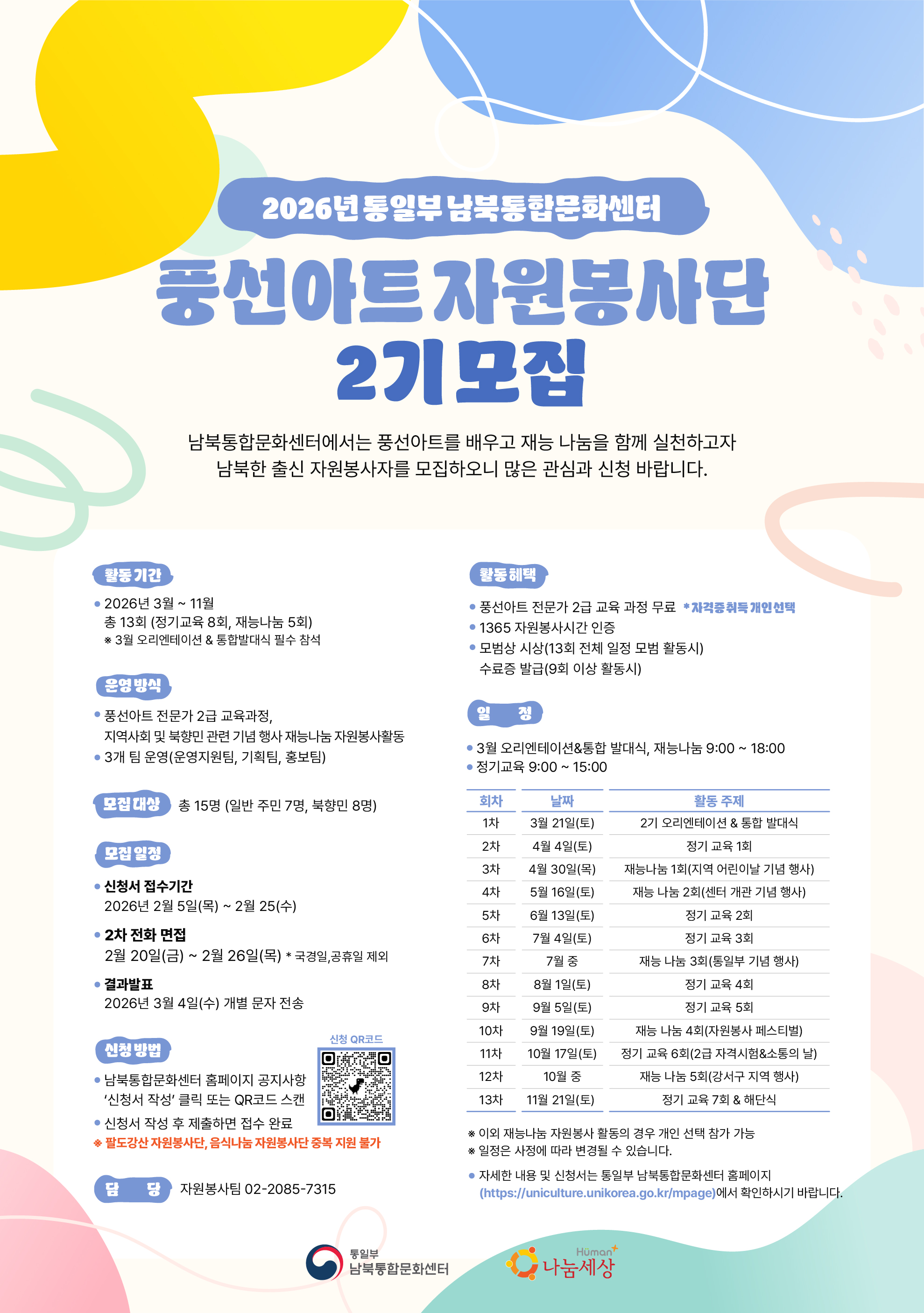 3. 선정 절차: 남북통합문화센터 홈페이지 방문 또는 포스터 QR코드 스캔 → 신청서 작성 후 제출 → 전화 면접(2.20~2.26/ 담당자 전화 연락)