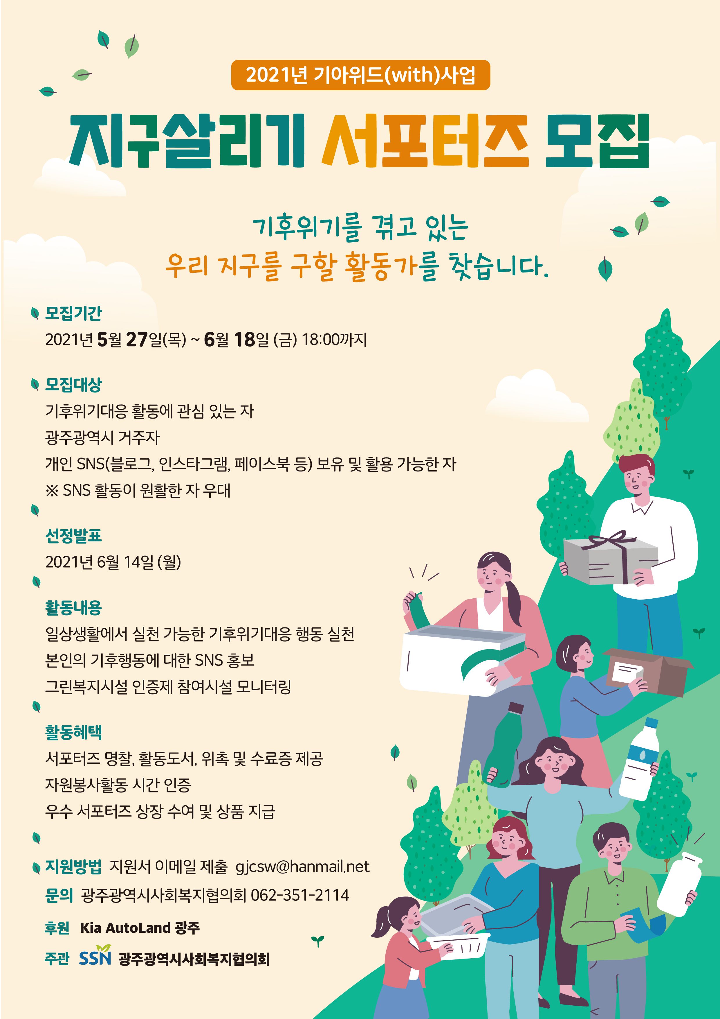광주광역시사회복지협의회에서 진행하는 ‘사회복지현장의 지구살리기 프로젝트’ 사업은 기아 오토랜드 광주의 후원으로 사회복지현장이 기후위기에 주체적 참여하고 나아가 광주 전체로 참여를 확산하고자 기획한 프로젝트입니다.