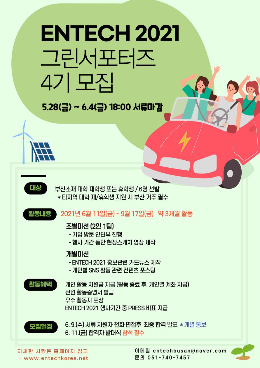 - 이메일 전송 시 “ENTECH 2021 그린서포터즈 4기 지원자 ○○○” 통일