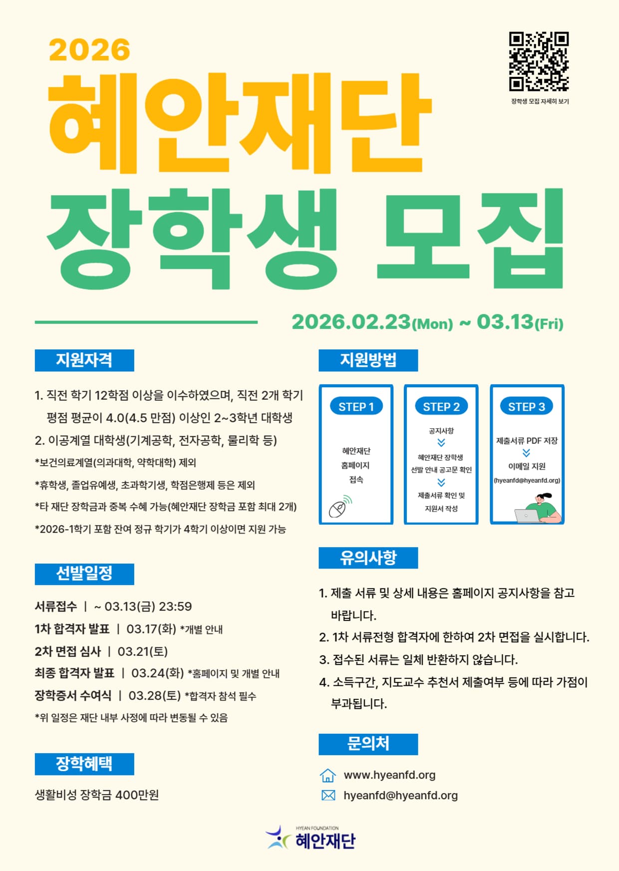 학업에 대한 열정과 가능성을 가진 대학생들을 지원하기 위해 2026년 제1기 혜안재단 장학생을 모집합니다.