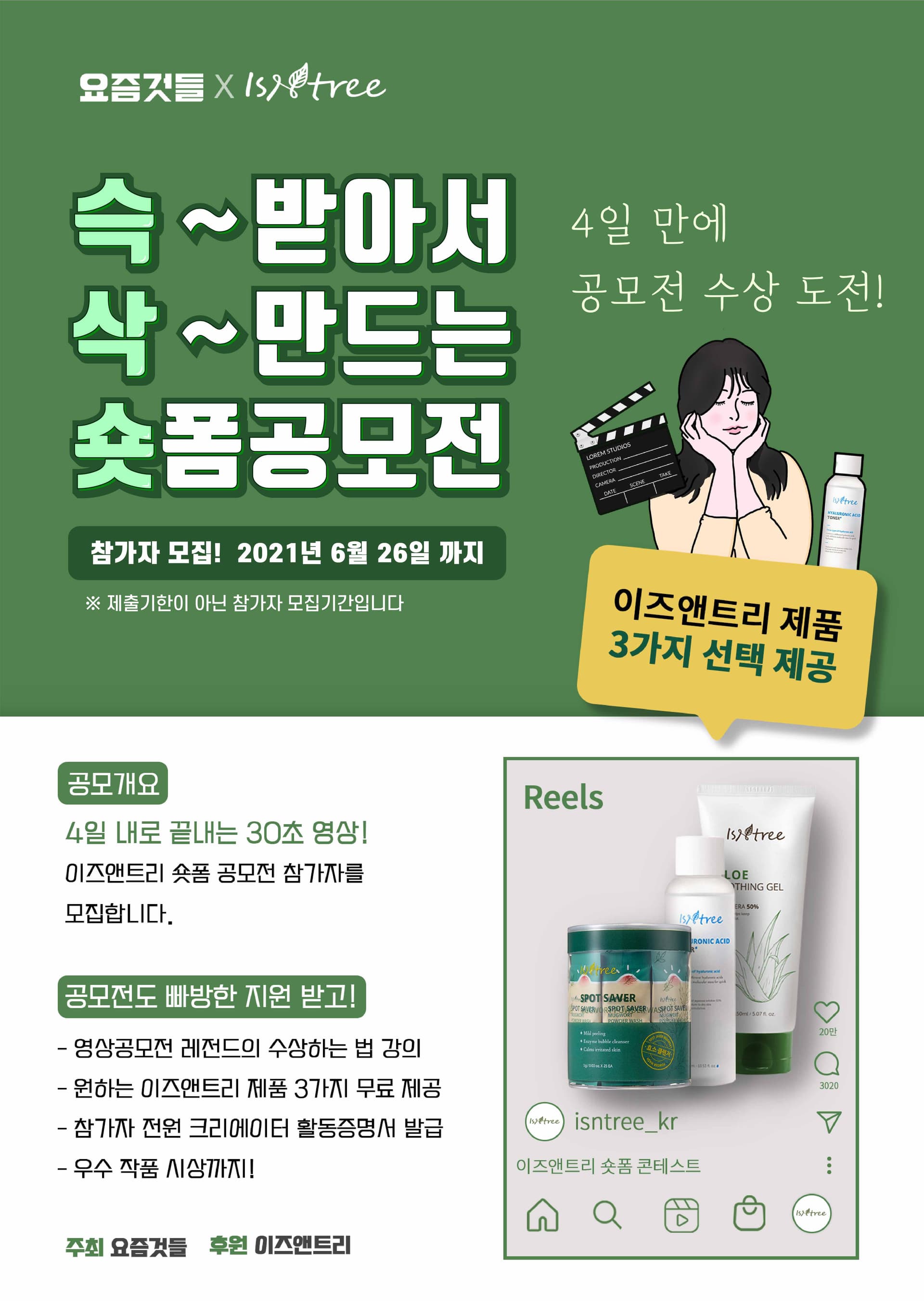 3) 이즈앤트리 제품을 활용한 30초 이내 인스타 릴스영상을 제작하여 제출 및 본인 인스타 업로드(필수 해시태그 꼭! 입력!)