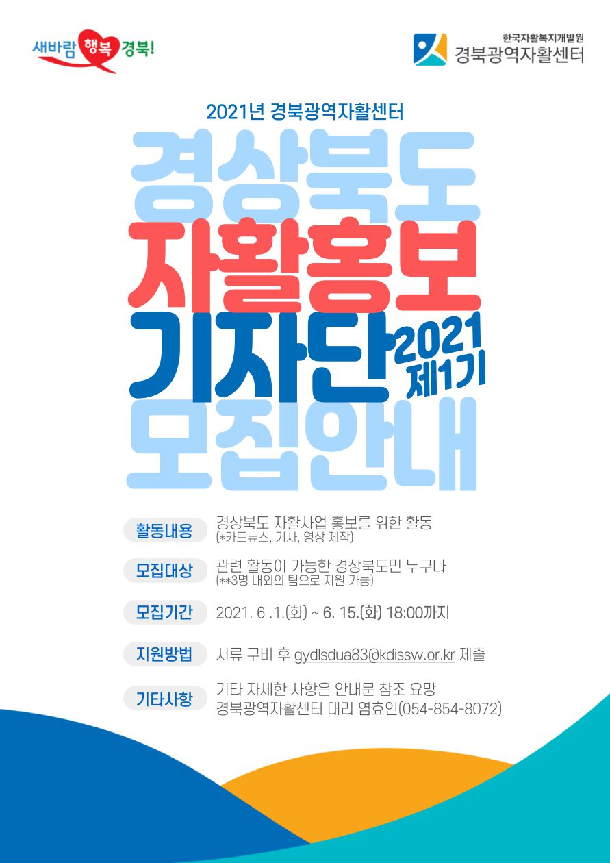 - 경상북도 자활사업에 대한 인지도 향상 및 관심 증대를 위해 일반인의 참여를 통한 다양한 관점의 자활사업 홍보를 진행하고자 경상북도 자활홍보 기자단을 다음과 같이 모집하오니 많은 관심 부탁드립니다