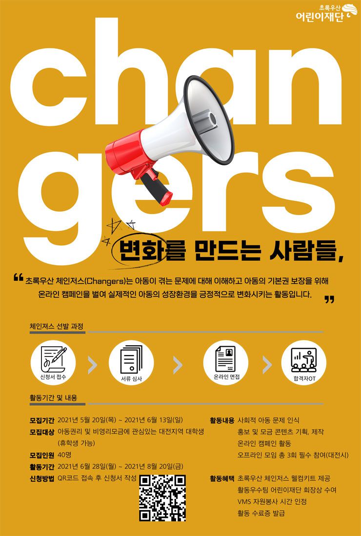 초록우산 체인저스(Changers)는 아동이 겪는 문제에 대해 이해하고 아동의 기본권 보장을 위해 온라인 캠페인을 벌여 실제적인 아동의 성장환경을 긍정적으로 변화시키는 활동입니다.