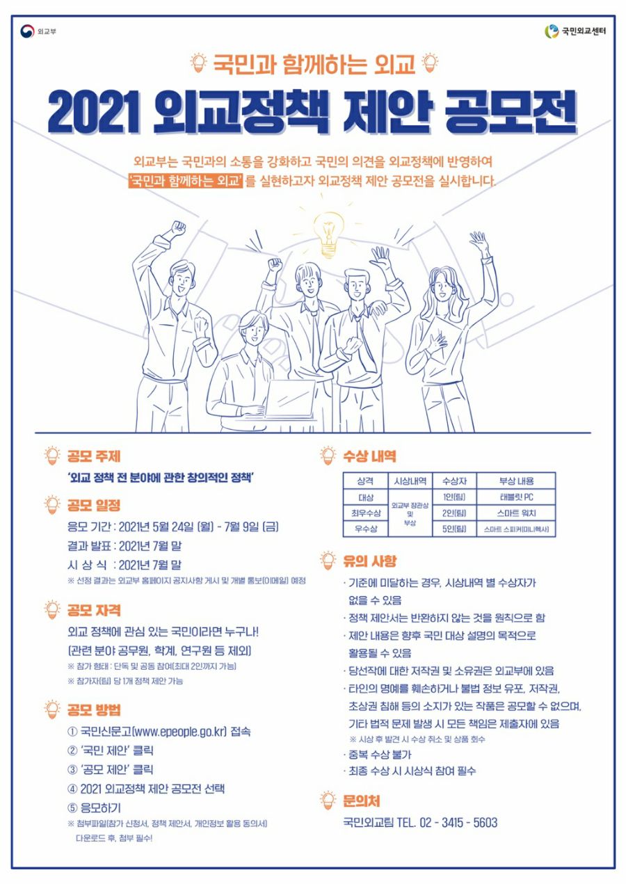 ⭐️ 안녕하세요! 이번에 외교부에서는 국민과의 소통을 강화하고 국민의 의견을 외교정책에 반영하고자 ‘국민과 함께하는 외교’를 실현하고자 외교정책 제안 공모전을 실시한다고 합니다 아래 내용을 읽어보시고 많은 참여 부탁드립니다⭐️