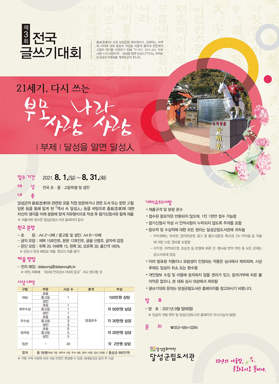 - 글쓰기대회 문의는 달성군립도서관 홈페이지를 참고하시기 바랍니다.