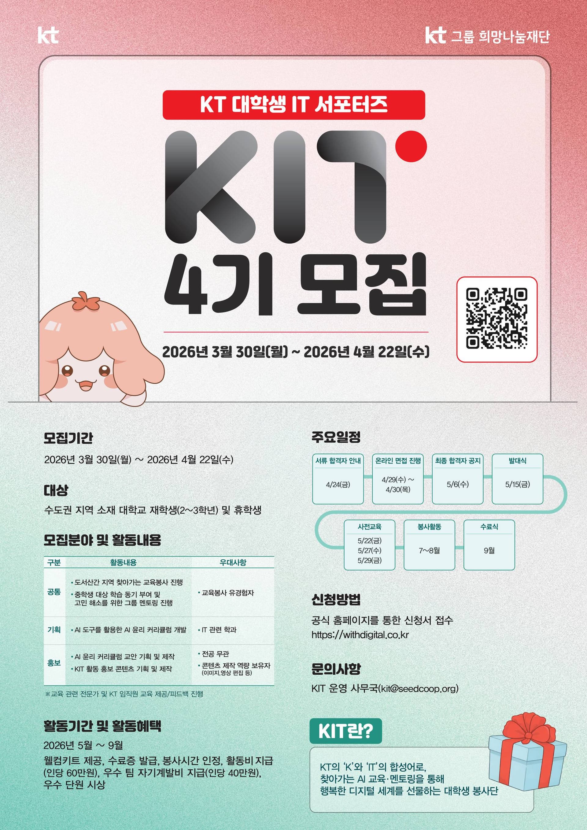 - 우대사항: 전공무관 교육 봉사 유경험자, 콘텐츠 제작(이미지, 영상 편집 등) 역량 보유자