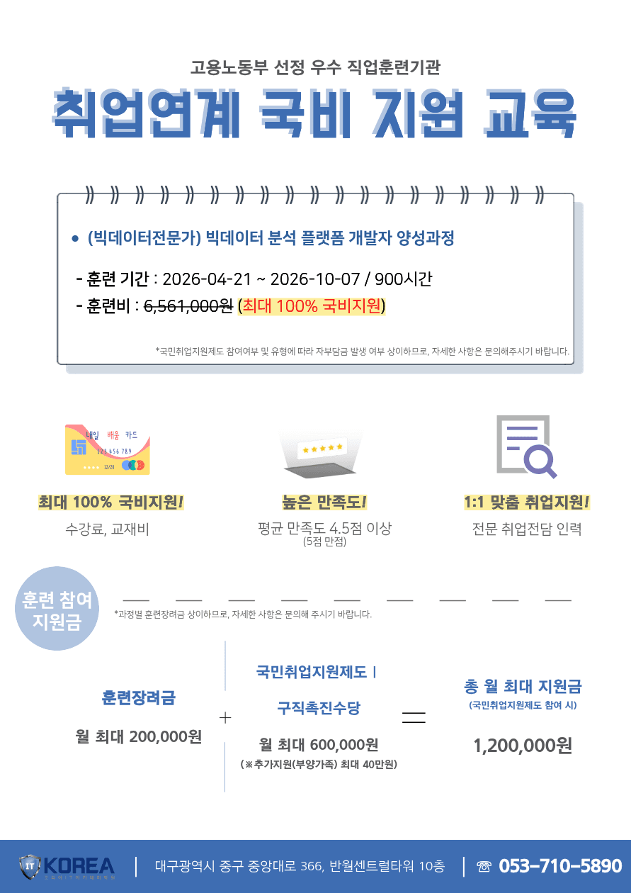 데이터 수집·처리·분석 및 플랫폼 설계·운영 역량을 갖춘 실무형 빅데이터 전문가로 성장할 수 있습니다.
