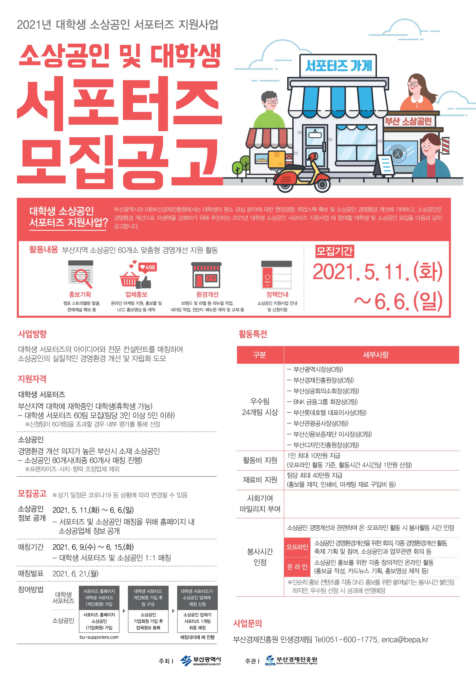 부산광역시와 (재)부산경제진흥원에서는 대학생의 평소 관심 분야에 대한 현장경·취업스펙 확보 및 소상공인 경영환경 개선에 기여하고, 소상공인은 경영환경 개선으로 자생력을 강화하기 위해 추진하는 2021년 대학생 소상공인 서포터즈 지원사업 에 참여할 대학생 및 소상공인 모집을 다음과 같이 공고합니다.