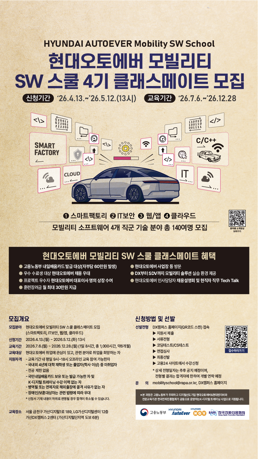 본 과정은 고용노동부가 주최하고 디지털선도기업인 현대오토에버&현대엔지비와 전문교육기관인 한국전파진흥협회가 주관하여 공동 운영하는 K-디지털 트레이닝의 디지털선도기업아카데미 사업으로 지원됩니다.