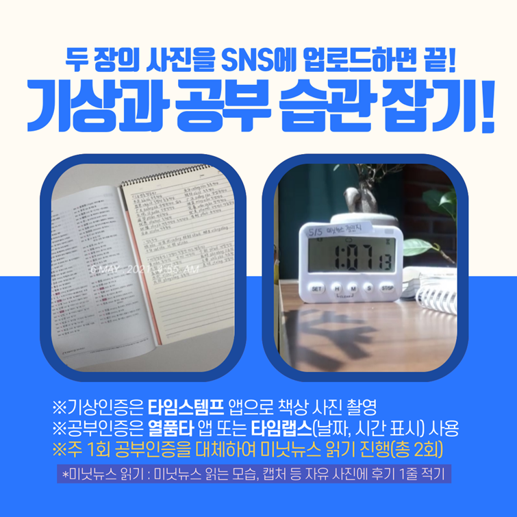 - 기상인증 : 4시 ~ 8시 사이 책상 촬영