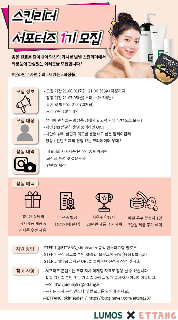 화장품에 대한 열정이 가득한 스킨리더가 되어주실 여러분을 초대합니다.