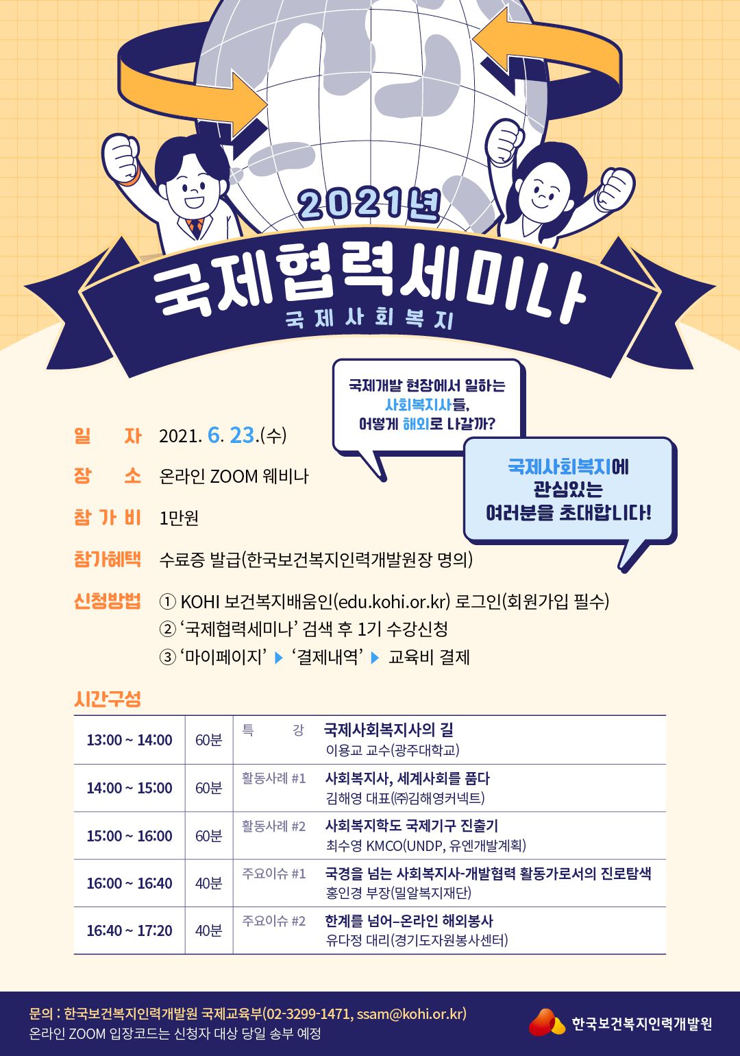 한국보건복지인력개발원에서 제1기 국제협력세미나(국제사회복지)를 실시합니다.
