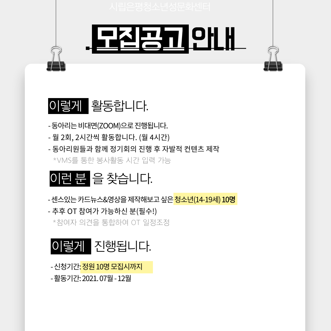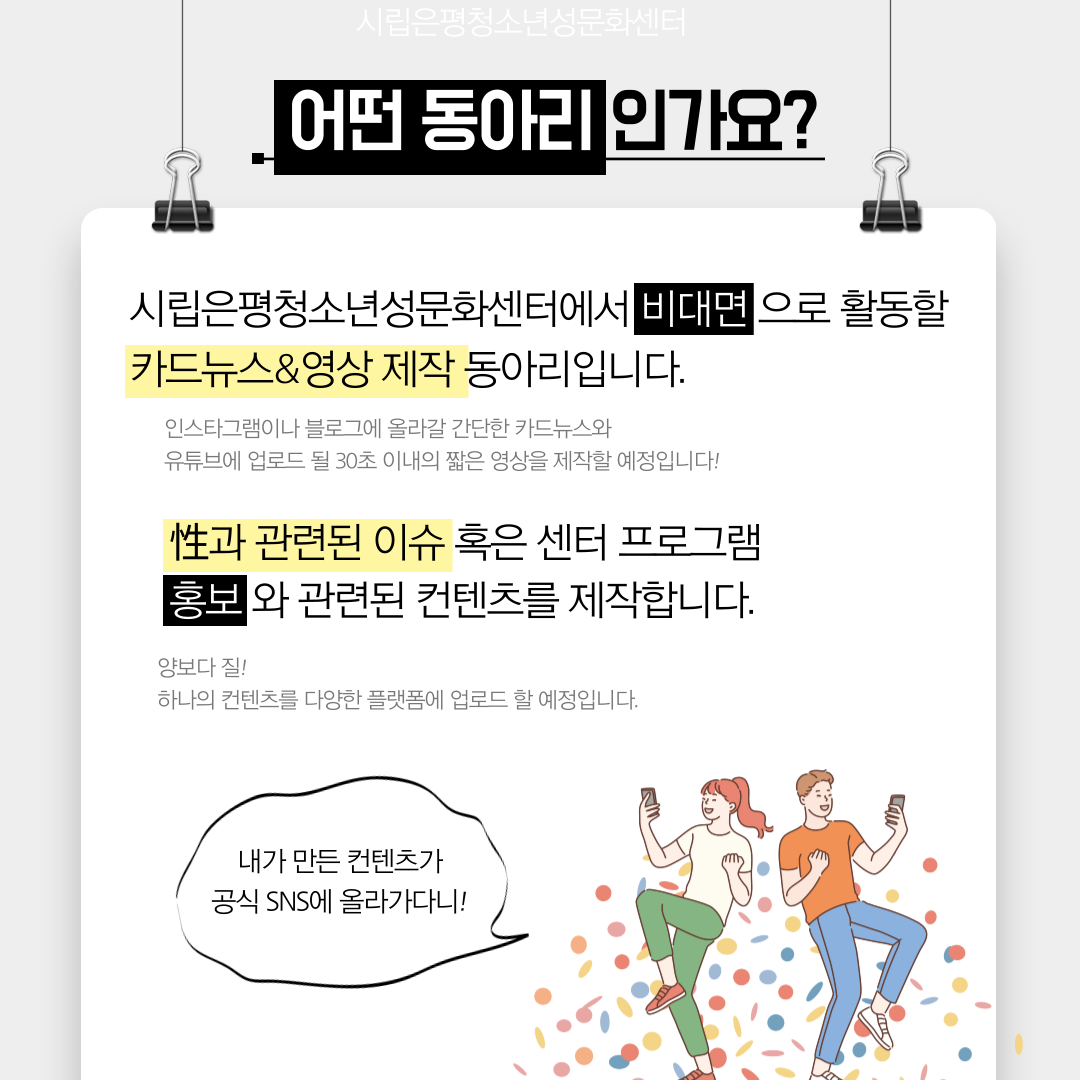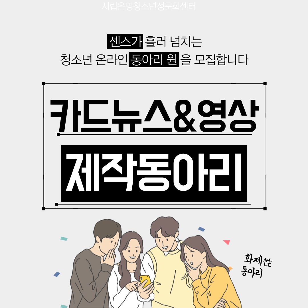 은평청소년성문화센터와 함께 카드뉴스와 간단한 영상을 제작할 청소년 동아리원을 모집합니다!