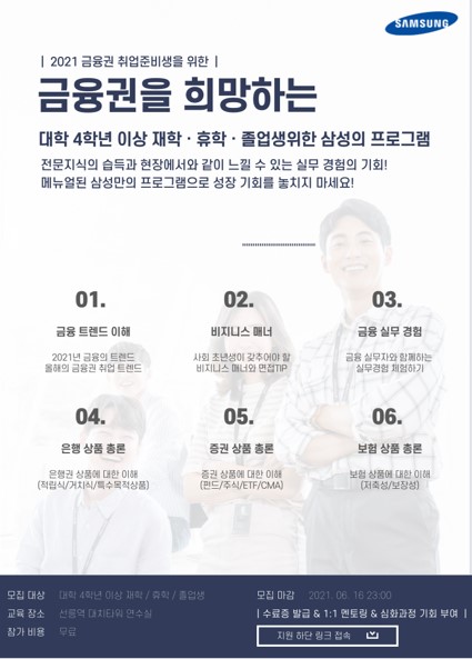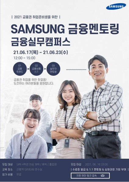 특히! 금융권 실무 경험이 없어 기관과 직무를 선택하는 데 어려움이 있거나 정한 진로에서의 실무는 몰라 고민인 학생들을 위해서 직무 상담 멘토링 또한 진행 예정이니, 많은 도움 받고 모두 금융인으로서 성공하기 바랍니다.
