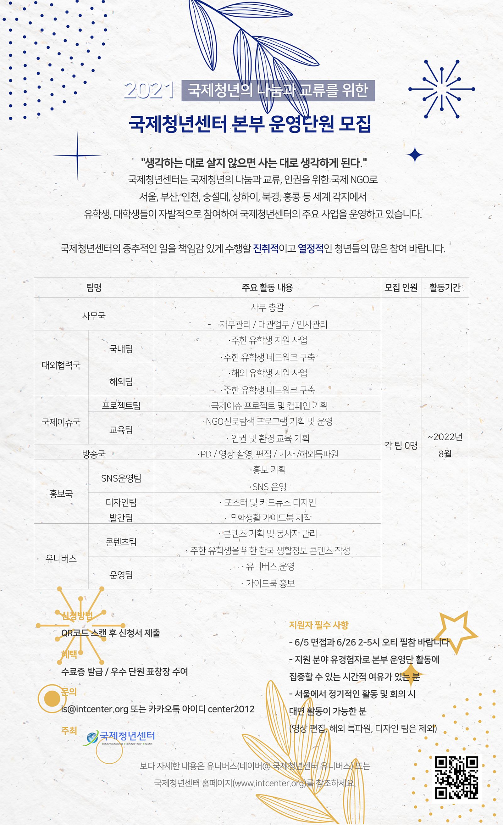 국제청년센터 국내외 지부가 늘어나면서 지부간의 협력, 지역과 상관없이 추진되는 사업을 관리, 운영하기 위해 본부를 두게 되었으며 본부 운영단을 모집합니다. 부산지부 봉사단은 추가 모집 입니다.