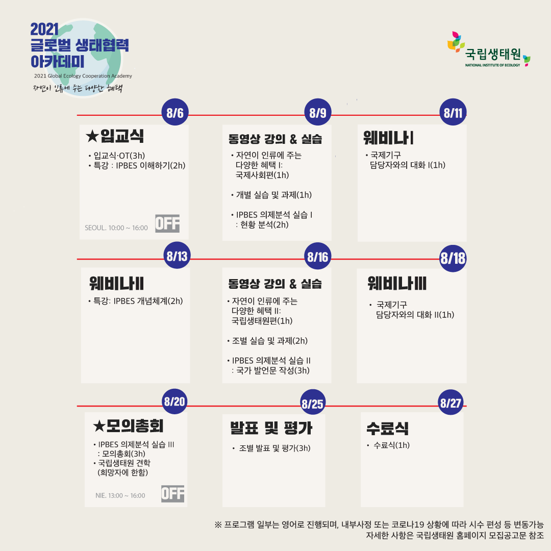 ○ 주요내용: 국내외 환경‧생태 국제협력 현황, 환경‧생태 국제기구 (IPBES)의 이해, 글로벌 생물다양성 및 생태계서비스 평가 참여 등 ※동영상 강의, 웨비나, 모의총회 실습, 조별토론 및 과제수행 포함 총 26시간 온 오프라인 혼합형 아카데미