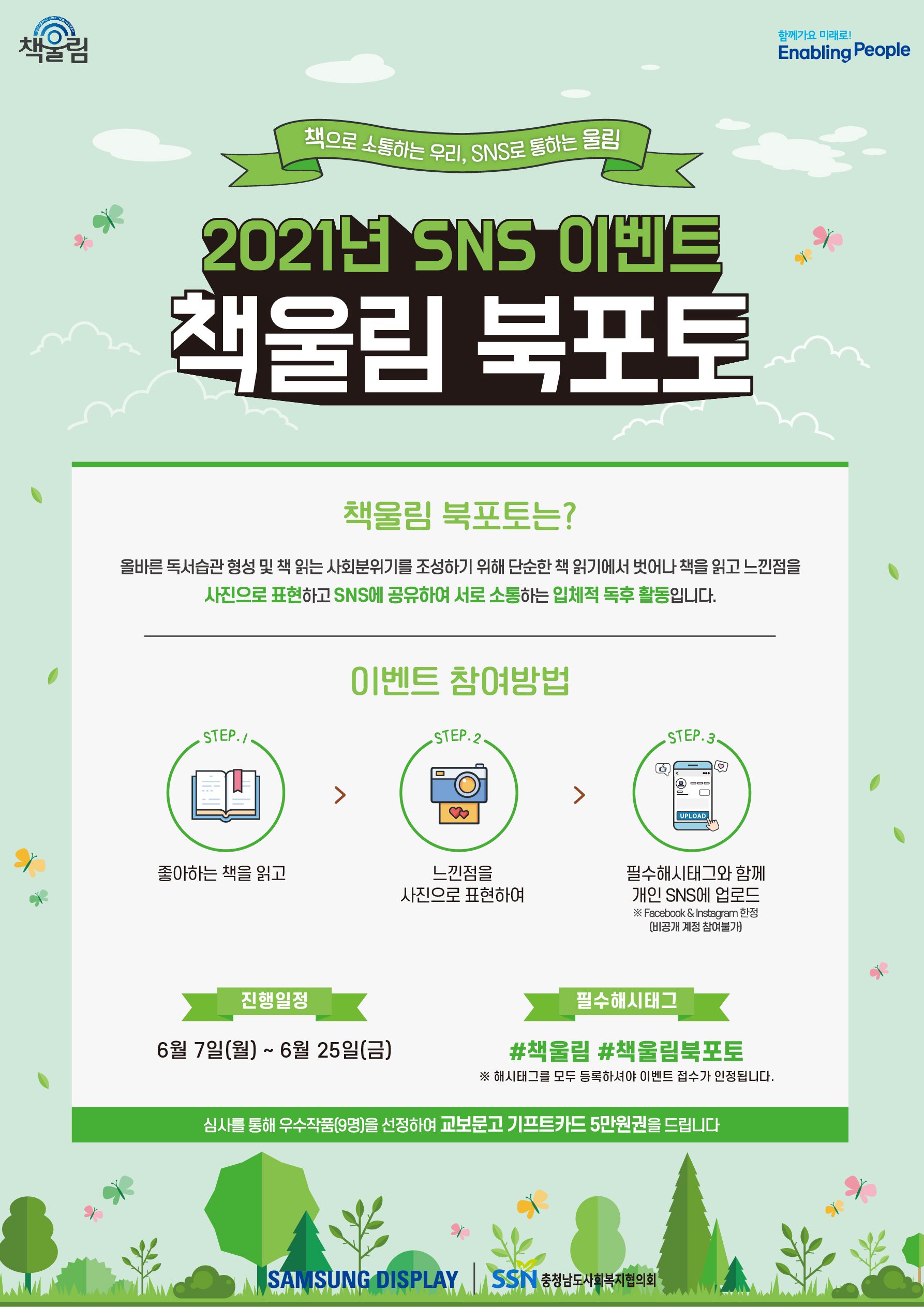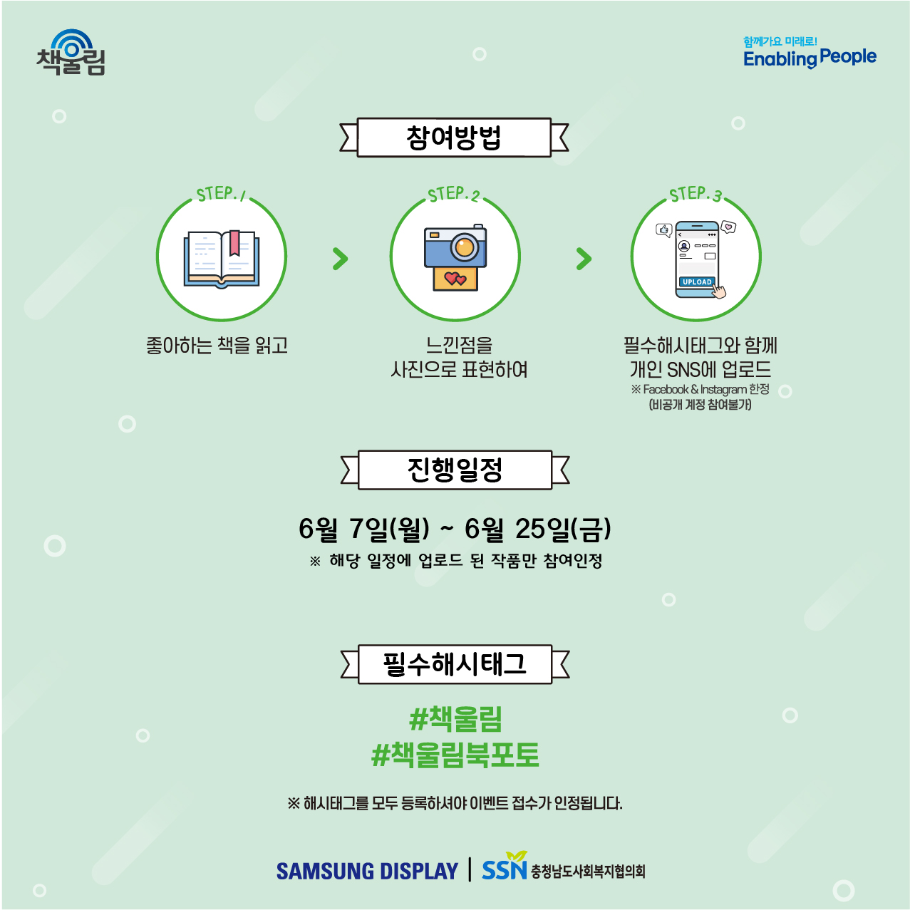 - 감명깊게 읽은 책을 "사진"으로 공유하고, "필수해시태그"와 함께 SNS에 업로드 하여 이벤트에 참여해주세요
