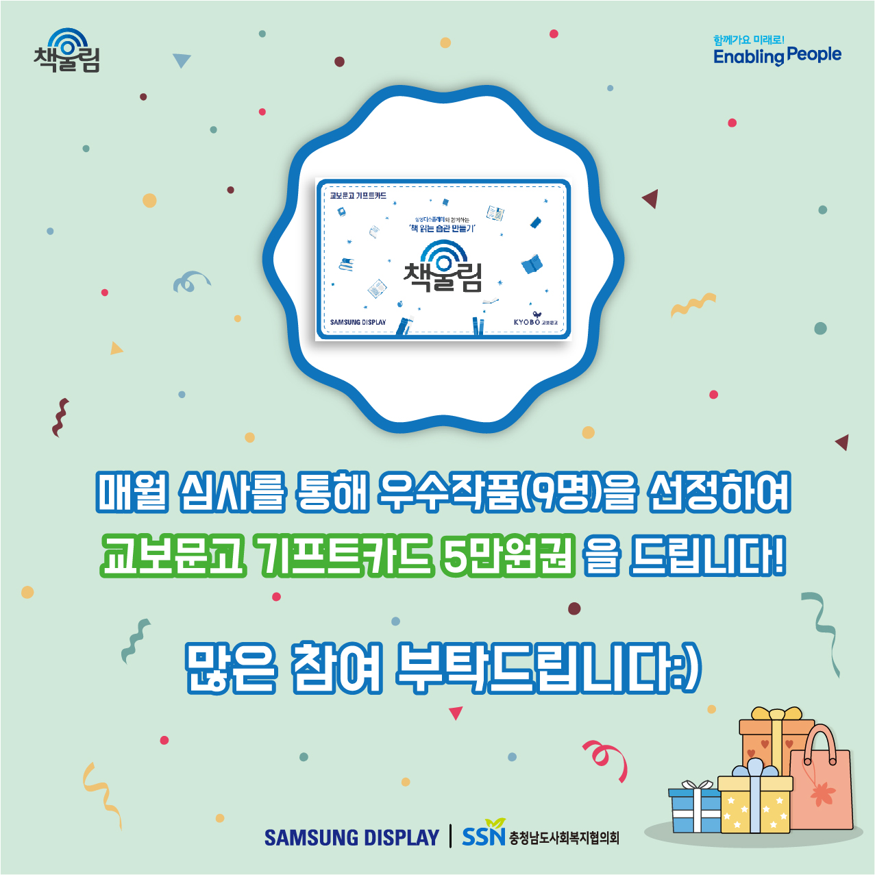 - 심사를 통해 우수작품으로 선정된 9분에게 교보문고와 핫트랙스에서 사용 가능한 '책울림 기프트카드(5만원)'를 드립니다.