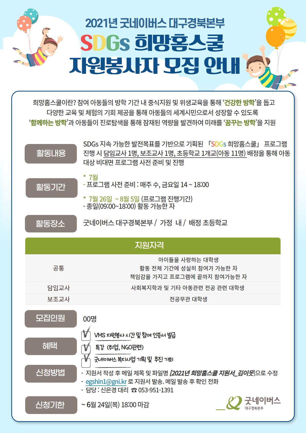 가. 활동명 : 2021 굿네이버스 대구경북본부 'SDGs 희망홈스쿨' 자원봉사자 모집