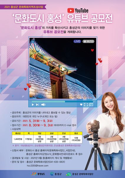 문화도시 홍성의 가치를 확산시키고 홍성군의 이미지를 찾지 귀한 유튜브 공모전을 개최합니다. 많은 관심과 지원바랍니다.