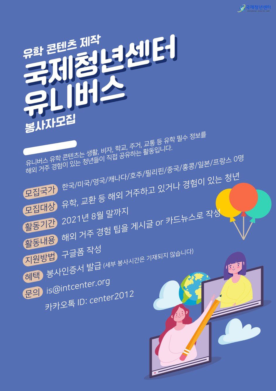 국제청년센터 유니버스 유학 콘텐츠 제작 봉사자 모집