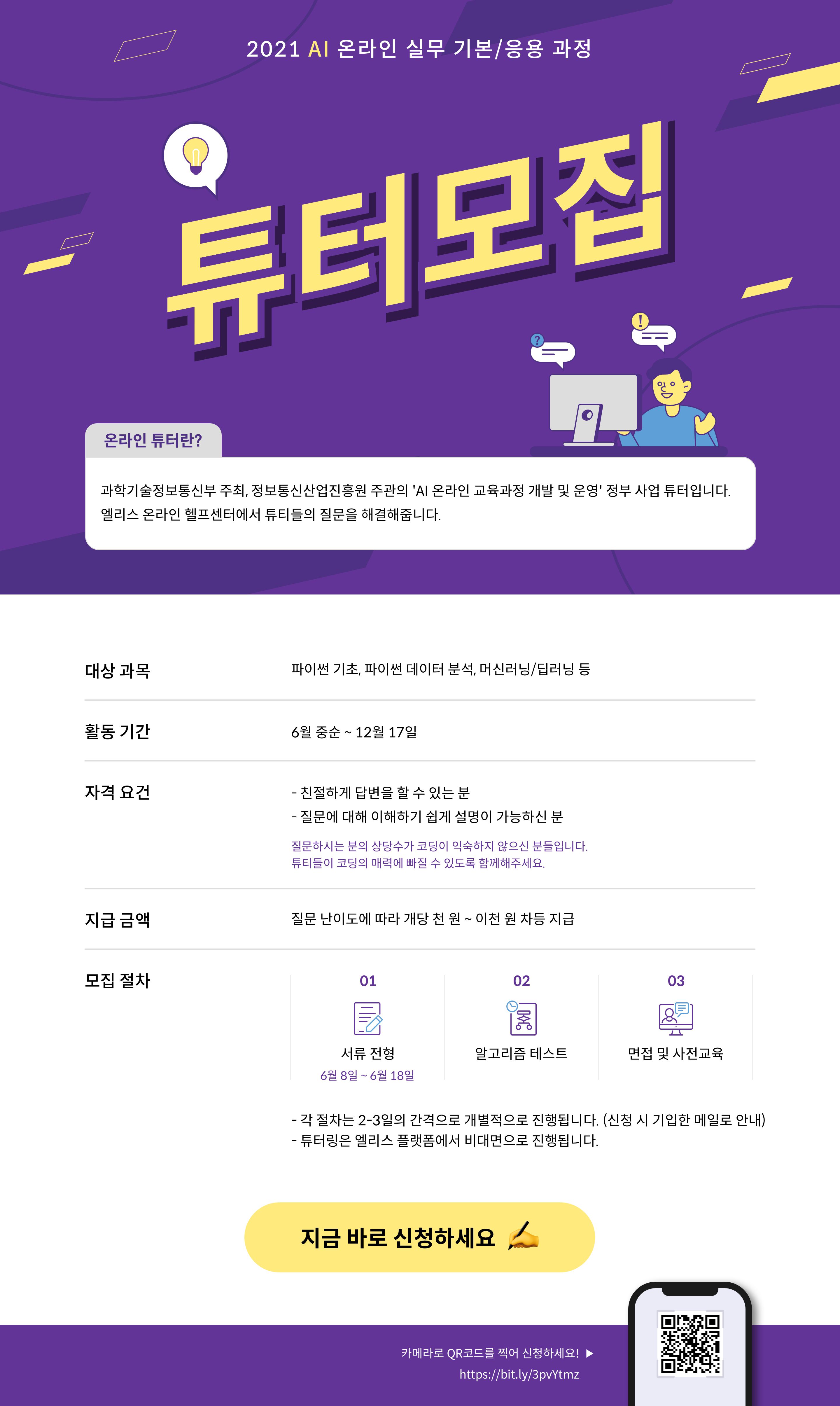 엘리스에서 ‘AI 온라인 실무 기본/응용 과정’ 온라인 튜터를 모집합니다! 🚀