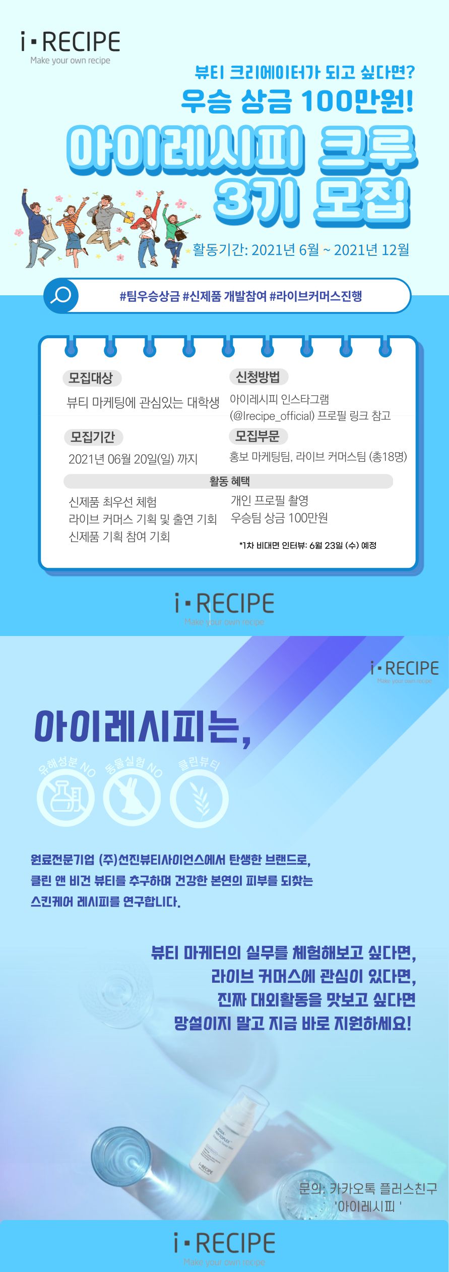 주요 활동 : 아이레시피의 대학생 홍보대사로써 마케팅 컨텐츠 제작 및 라이브커머스 기획 미션 수행
