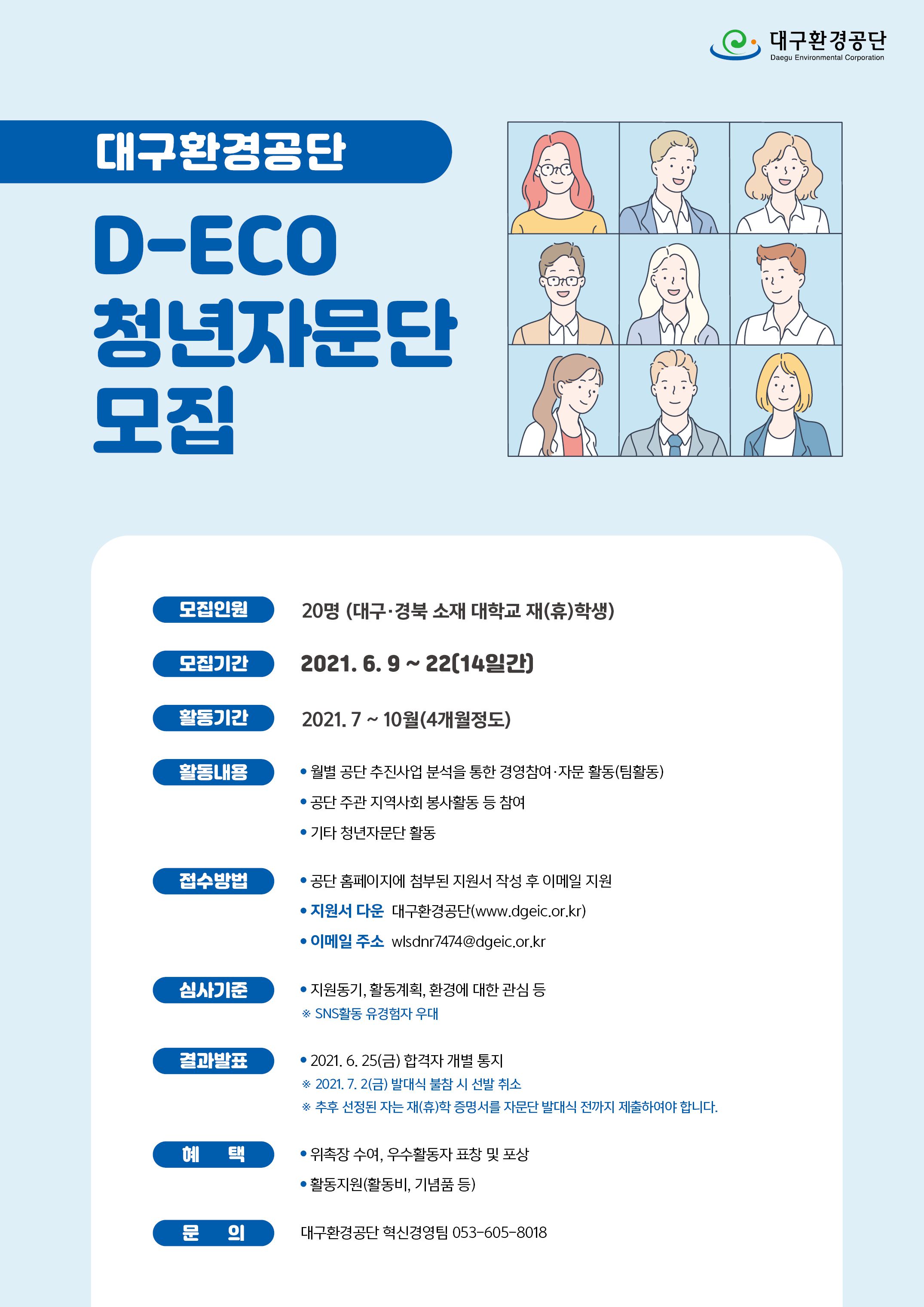 대구환경공단에서 환경을 사랑하는 열정 가득한 청년자문단을 모집합니다.
