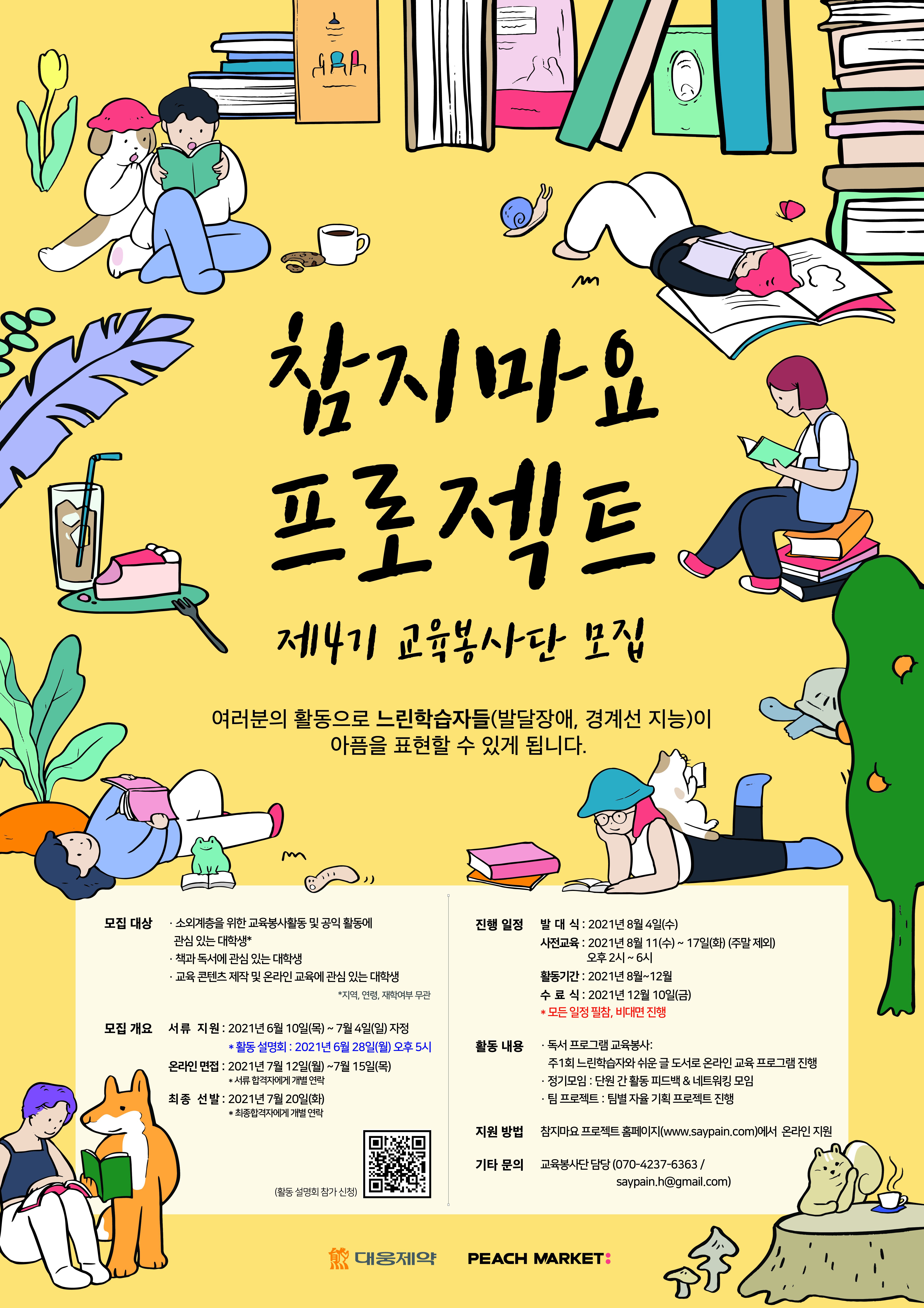 - 독서 프로그램 교육봉사 : 주1회 느린학습자와 쉬운 글 도서로 온라인 독서교육 프로그램 진행 + 독서 활동콘텐츠 제작 및 회의