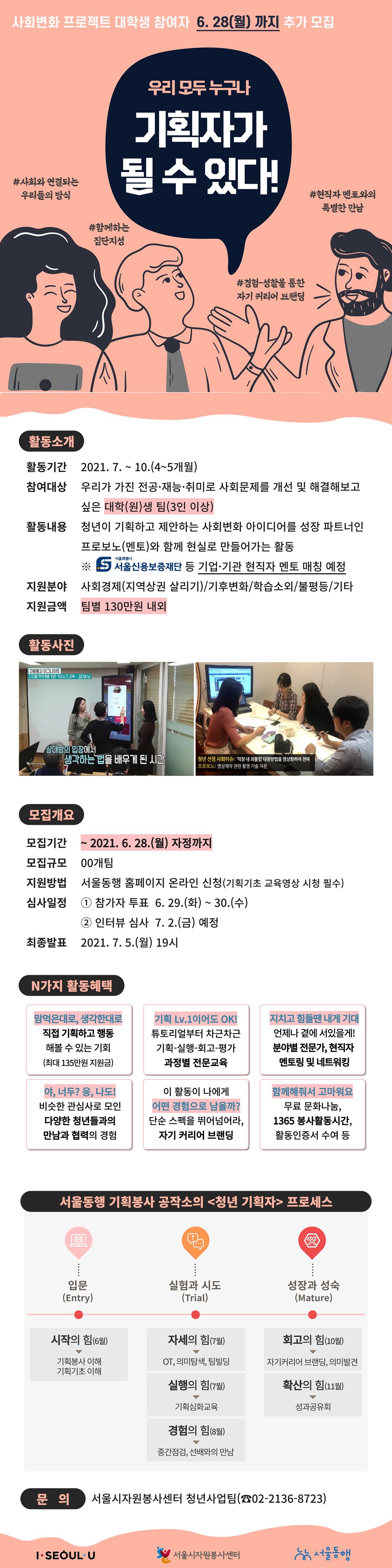 ● 지원자격 : 우리가 가진 전공이나 재능을 살려 사회변화에 기여하고 싶은 대학생, 대학원생, 휴학생(3인 이상/1팀)