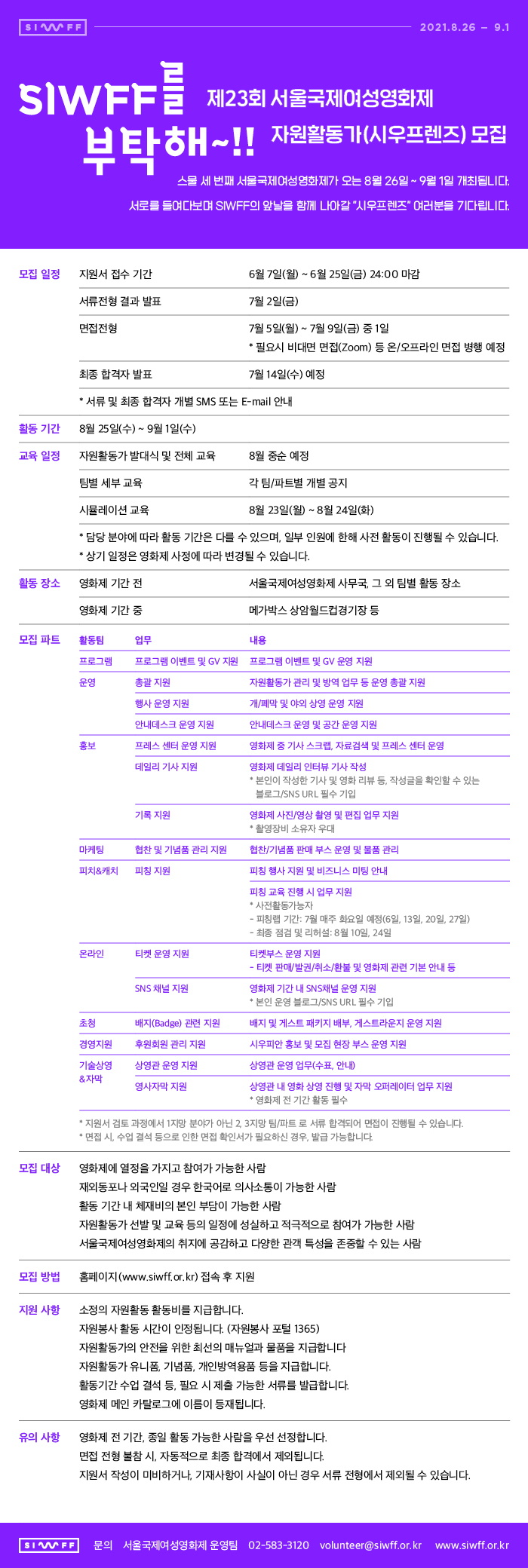 T. 02-583-3120 E. volunteer@siwff.or.kr W. www.siwff.or.kr