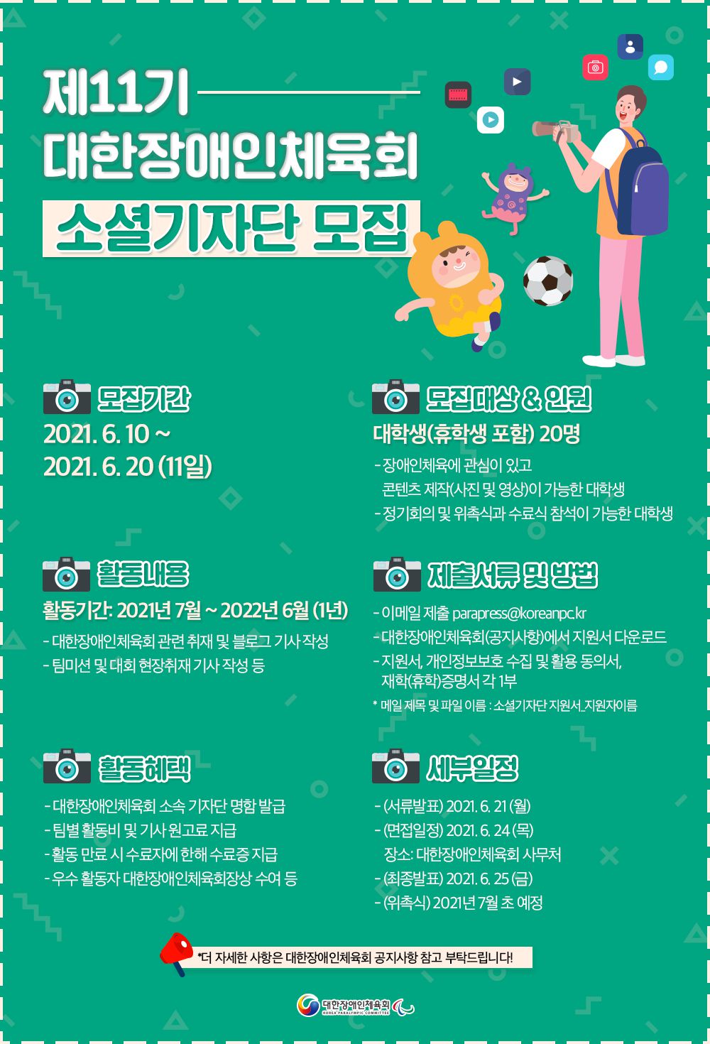 *다양한 장애인체육 현장 소식을 취재하고, 스포츠 콘텐츠를 직접 만들어볼 수 있는 본 활동에 대학생 여러분의 많은 관심을 바랍니다. 더 자세한 사항은 대한장애인체육회 공지사항 참고 부탁드립니다.