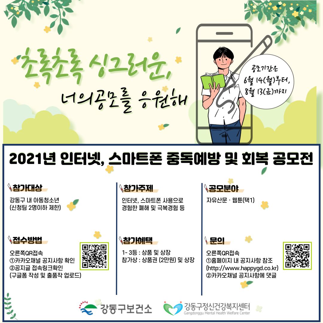 인터넷 · 스마트폰 과다 사용에 대한 경각심을 세우고자 아동 · 청소년 대상의 예방공모전을 시행하여 미디어과의존에 대한 이해와 공감의 장을 마련하고자 합니다.