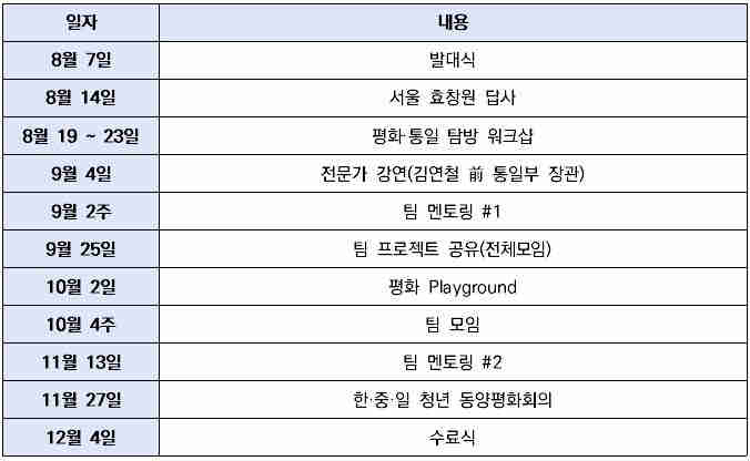 * 코로나 19 등의 이유로 서울시 평화·통일 청년리더 활동은 3기와 4기로 나누어 운영됩니다.