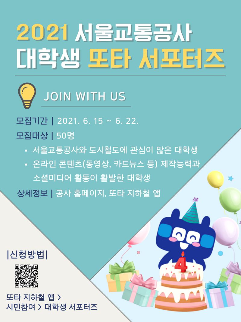 ❚ 지원방법 : 서울교통공사 또타 지하철 앱 > 시민참여 > 대학생 서포터스