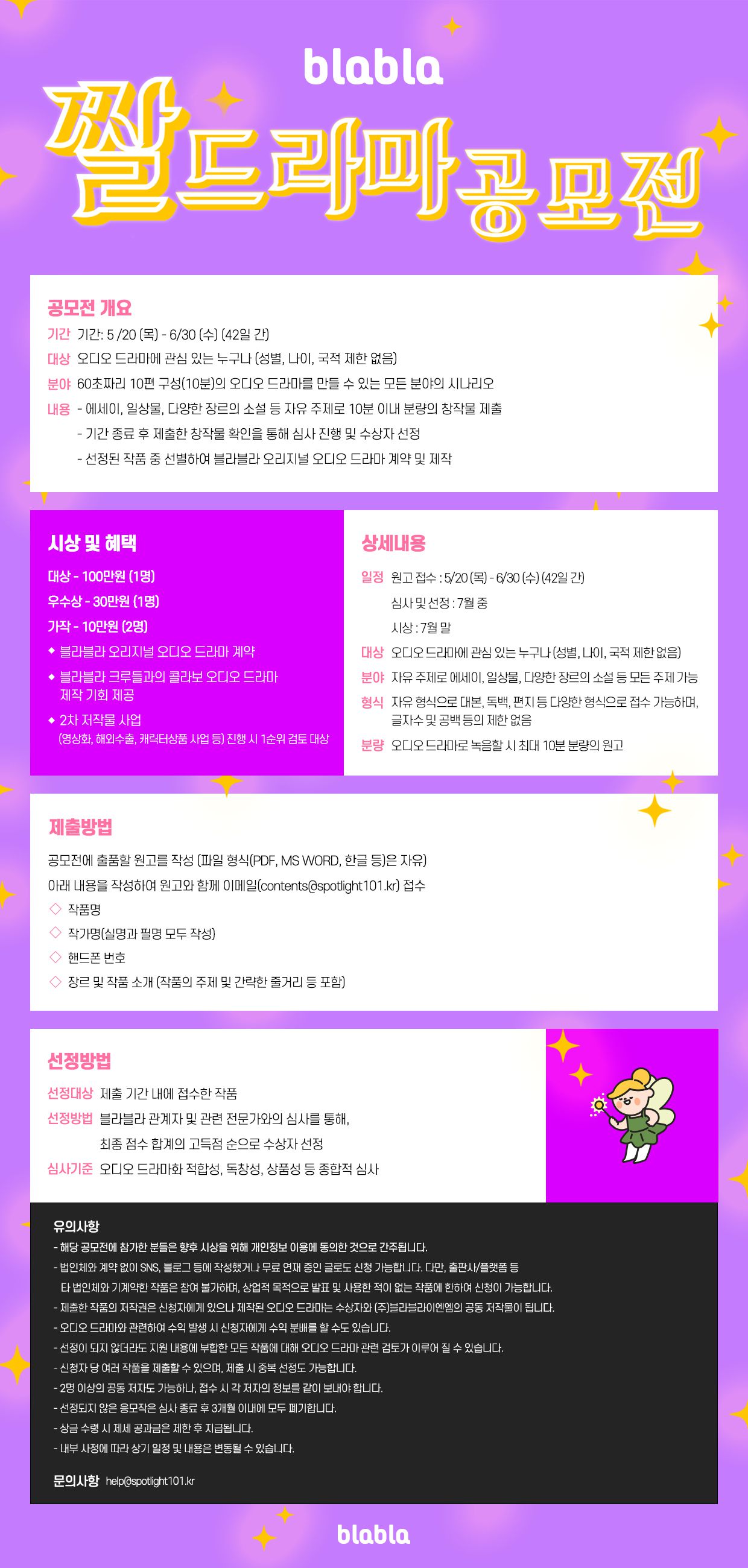 공모전과 관련한 자세한 내용은 첨부파일 포스터 또는 www.blabla.audio 상단 배너를 확인해 주세요!