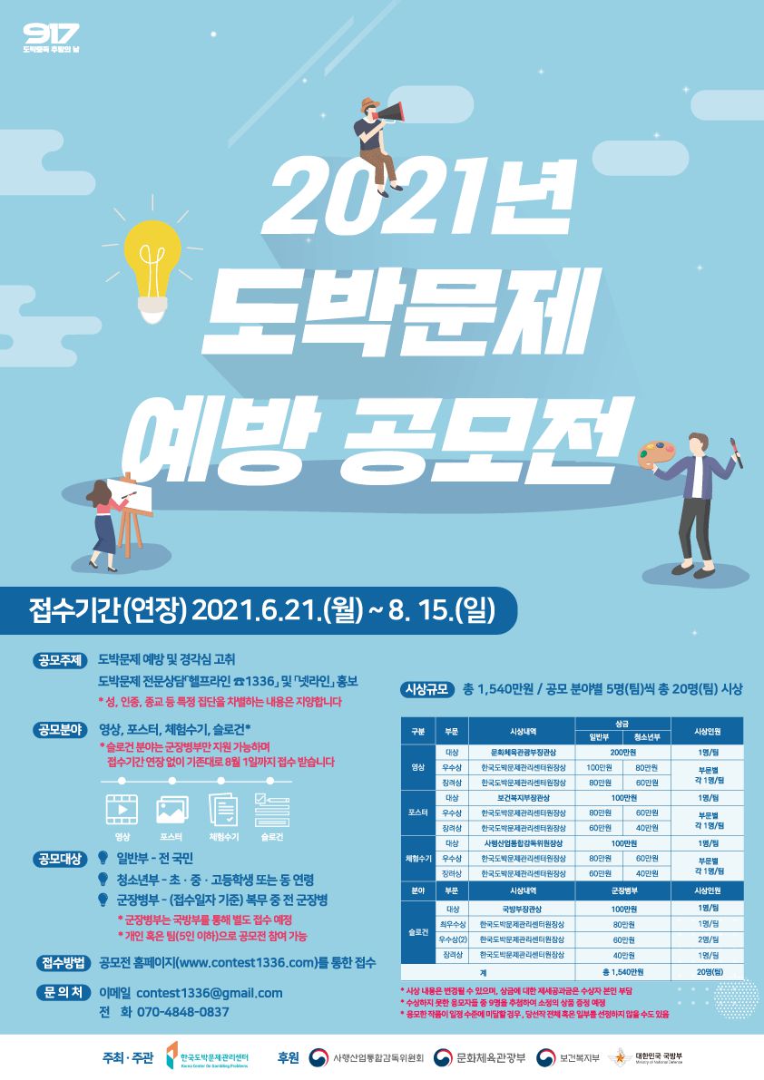 한국도박문제관리센터는 도박문제에 대한 심각성을 알리고 도박문제 예방 효과 제고 및 도박문제 전문상담(헬프라인1336/넷라인)의 이용률을 높이기 위하여 2021년 도박문제 예방 공모전을 실시하오니 참신한 아이디어를 가진 여러분들의 많은 참여 바랍니다.