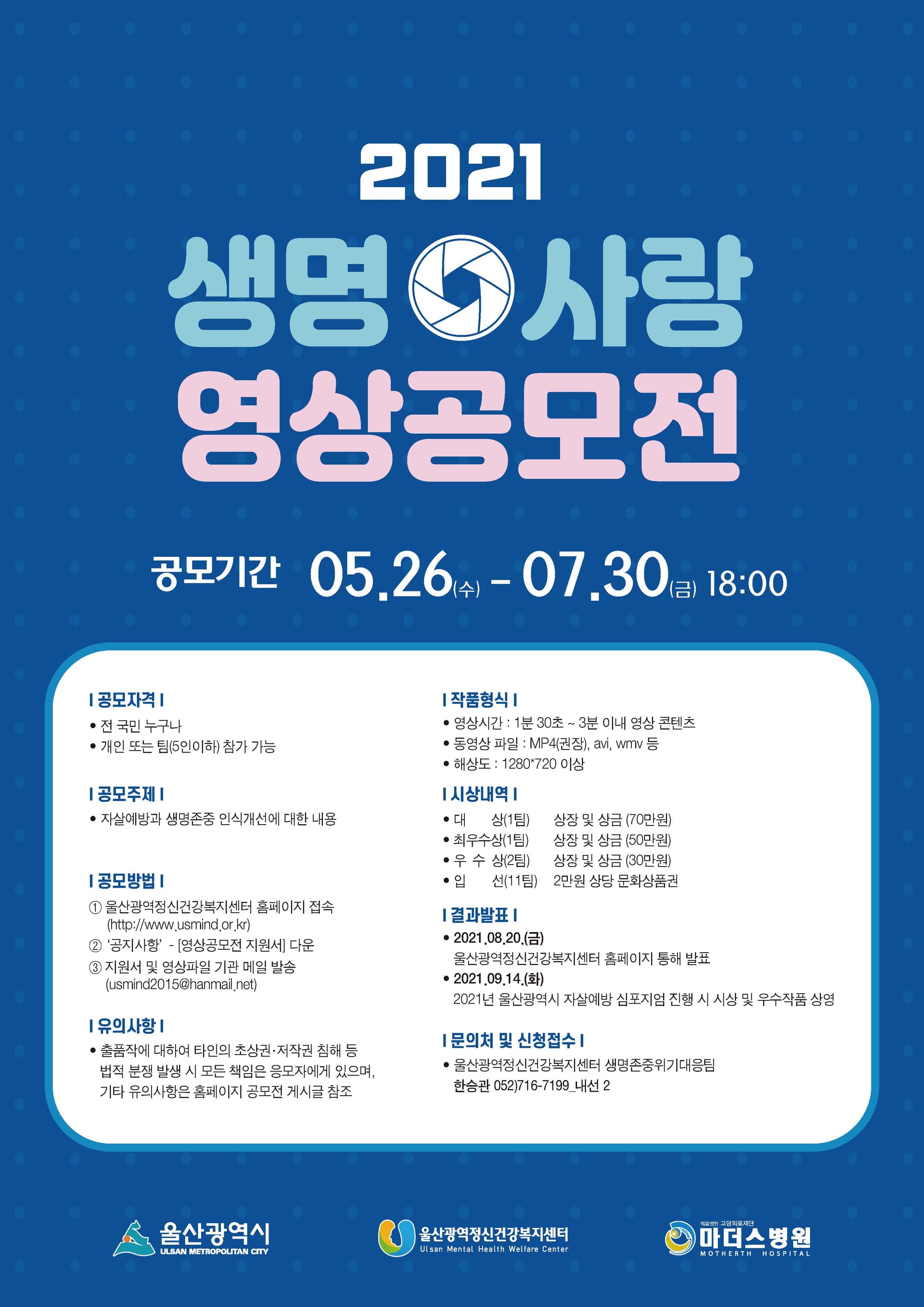 시민들의 생명존중 인식개선 및 생명사랑문화를 조성하기 위해 영상공모전을 준비하였습니다.