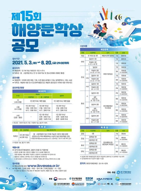 제15회 해양문학상을 아래와 같이 공모하오니 역량 있는 분들의 많은 관심과 참여 바랍니다.