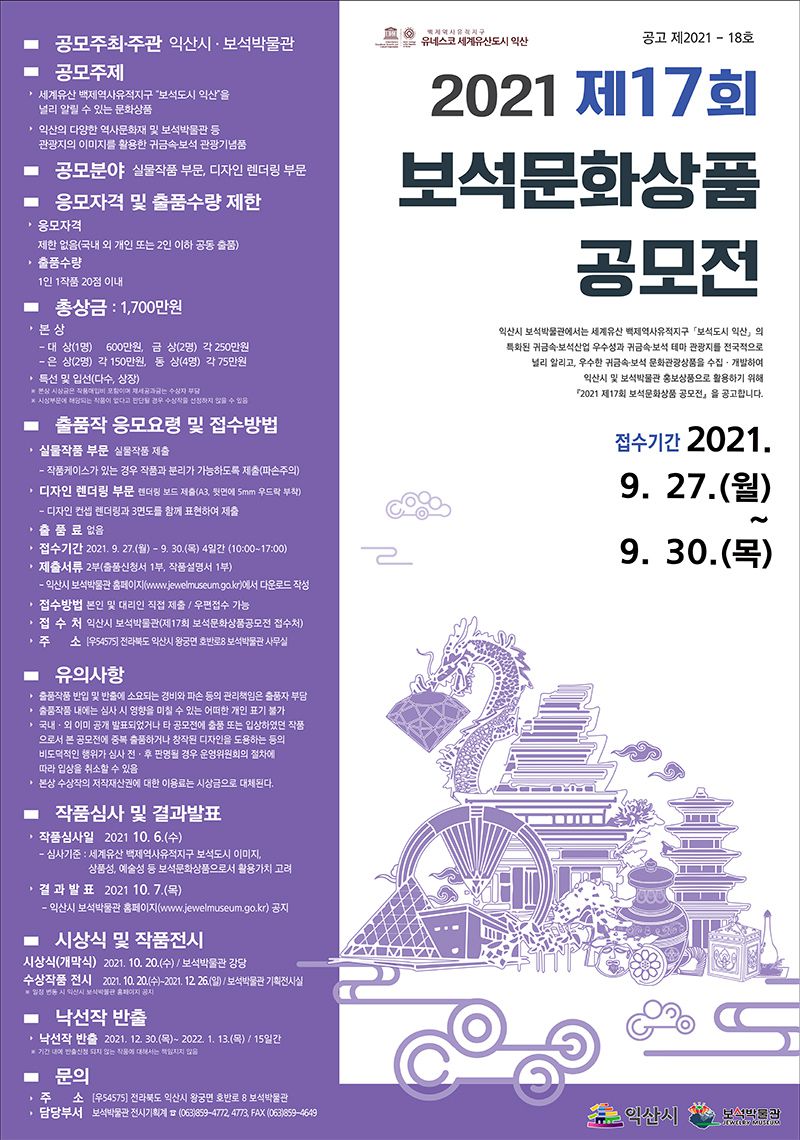 - 접 수 처 : 익산시 보석박물관(제17회 보석문화상품공모전 접수처)