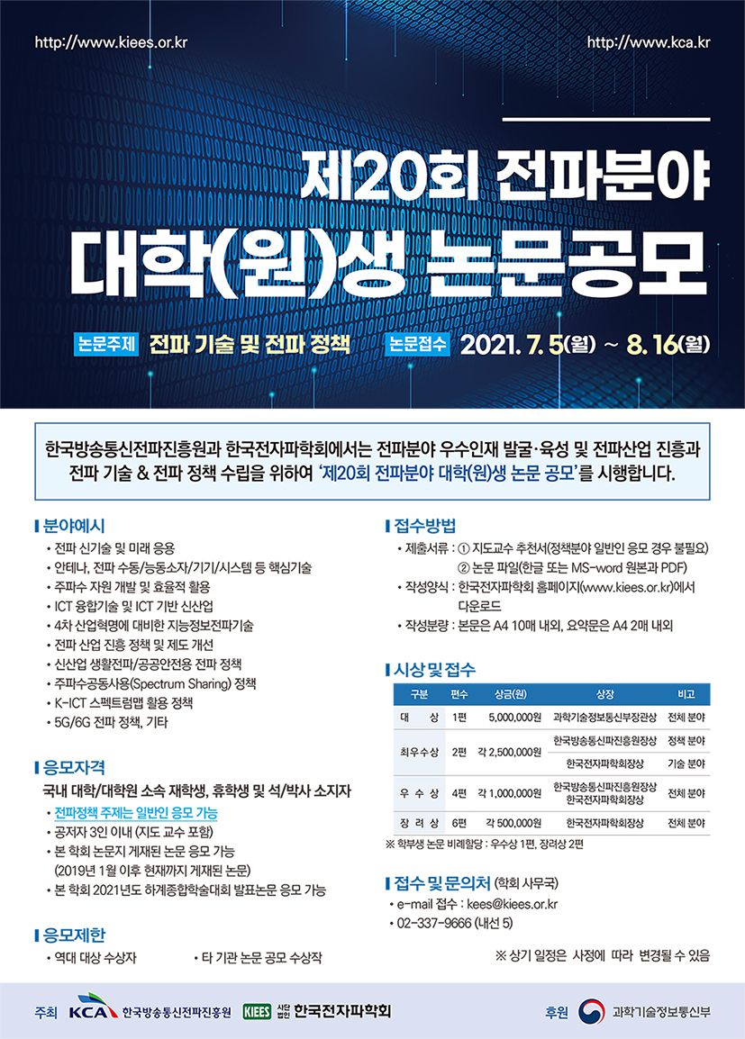 한국방송통신전파진흥과 한국전자파학회에서는 전파분야 우수인재 발굴, 육성 및 전파산업 진흥과 전파 기술 & 전파 정책 수립을 위하여 ‘제20회 전파분야 대학(원)생 논문공모(※전파/기술 정책분야 일반인 응모 가능)’를 다음과 같이 진행하오니 관심있는 대학(원)생 및 일반인 여러분들의 많은 참여 바랍니다.