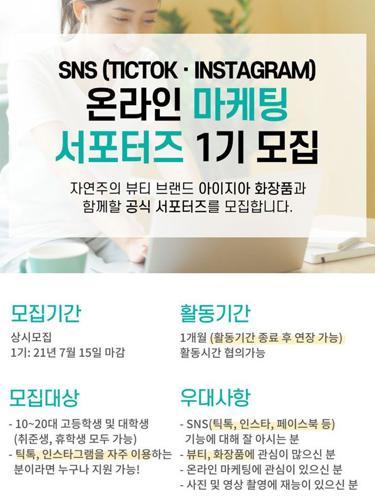 자연주의 뷰티 브랜드 아이지아 화장품과 함께할 SNS(틱톡, 인스타 등) 온라인 마케팅 공식 서포터즈 1기를 모집합니다.