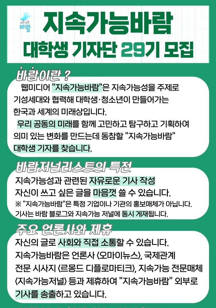 지속가능협동조합 바람과 함께 할 대학생 기자를 모집합니다. 지속가능 바람 대학생 기자단(YeSS, Young Entrepreneurs for Sustainable Society)은 다양한 사회 현상 속에서 지속가능성을 찾고 대안적 공동체를 만들기 위해, 기사작성과 외신번역을 비롯한 다양한 활동에 참여합니다. 실제로 바람에서는 이를 기반으로 역량을 키운 많은 언론인을 배출하고 있습니다.